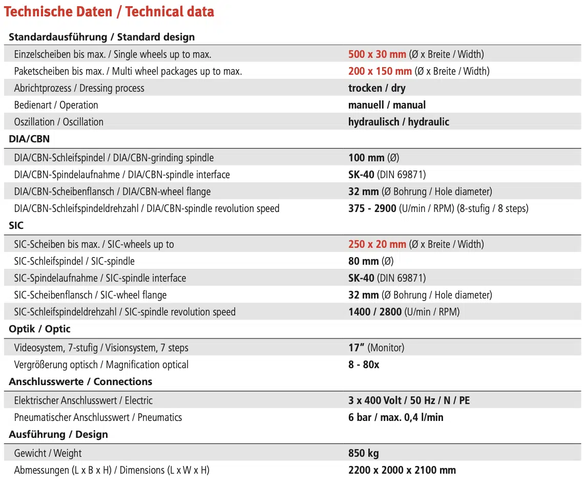 - DIA/CBN-Spindel: 100 mm Ø, Drehzahl 375 – 2900 U/min